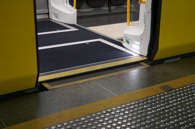 ノンステップ構造で、ホームとの隙間を少なくするために、渡り板が伸びてくる構造です。