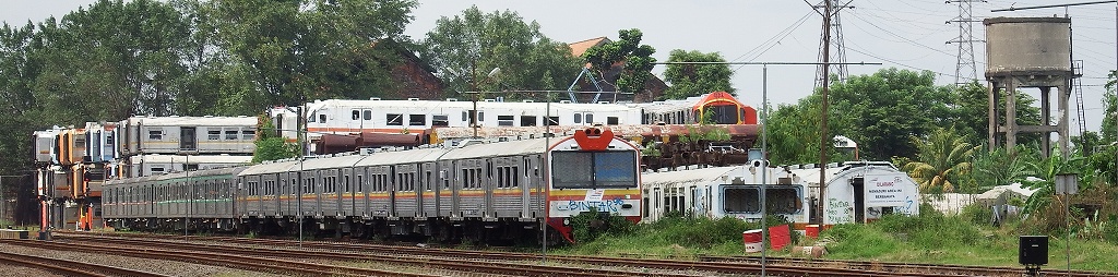 廃車体の山の傍らから発車するジャカルタ行きローカル列車。
