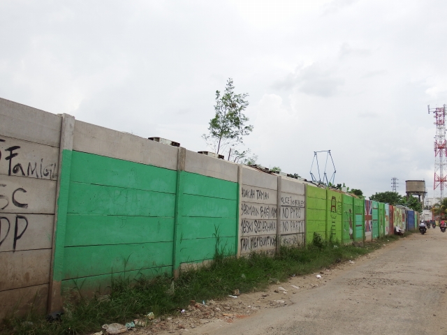 線路を渡ると廃車体の山に沿った道には背の高い長大な壁が設置されていました。