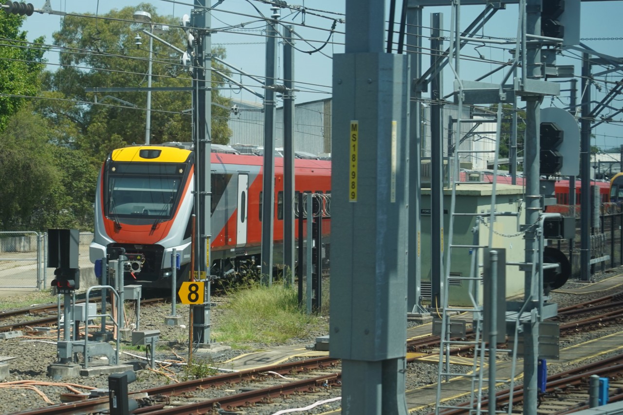 スコフィールズ駅方面へと走り去るR set試運転列車。この跨線橋で、体感40度近い炎天下の中を約2時間待っていましたが、列車の通過はほんの一瞬でした。