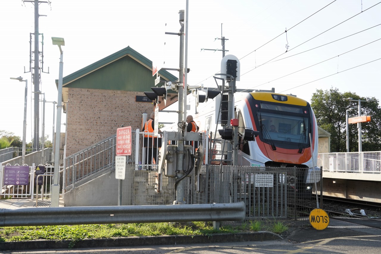 At Clarendon Station, there was no sign of the level crossing activating. The handheld “SLOW” board is likely used to ensure safety when the crossing protection is not operating during test periods. When staff pick up this board, it can often be taken as a sign that train movement is about to begin.