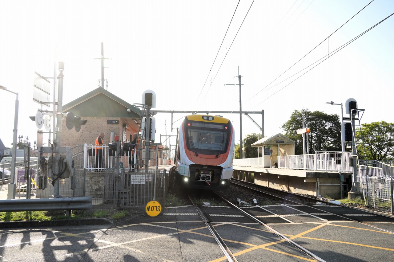 クラレンドン駅の西側には踏切があり、そこから試運転列車が停車している様子を撮影することが可能です。ただし午前中は強い逆光となりやすく、撮影条件はやや厳しめです。
