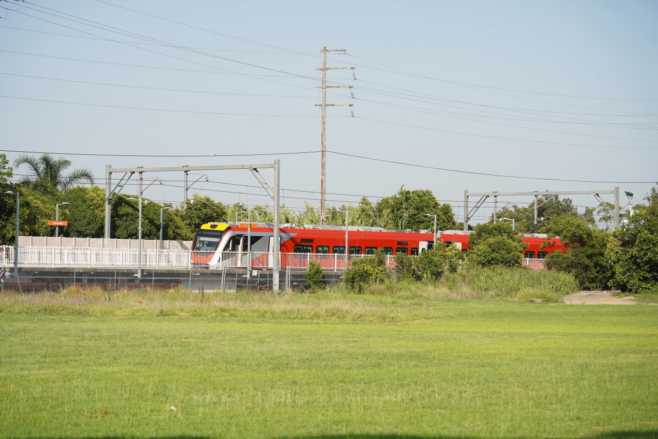 通常は走ることのないリッチモンド線の単線区間を走行するR set試運転列車。R setが営業運転で使用される予定の電化区間はいずれも複線のため、単線電化区間を走る姿は試運転ならではの貴重な光景といえます。
