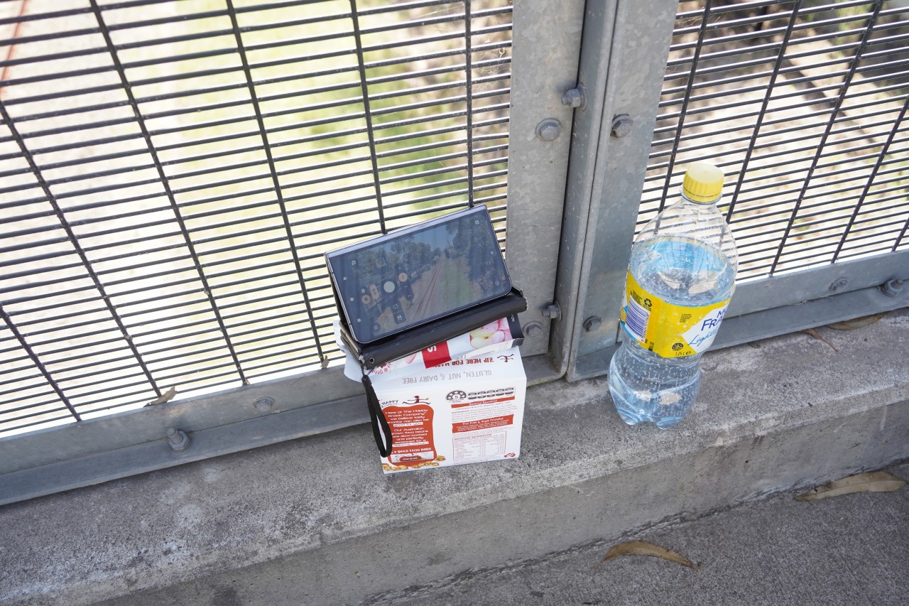 実はこの跨線橋、オーストラリアではよく見られる目の細かい金網で全面的に覆われた通路となっています。もちろん撮影用の穴は設けられていないため、小型レンズのスマートフォンで撮影するか、一眼カメラで絞りを最大限に開放して金網を目立たなくするなどの工夫が必要になります。