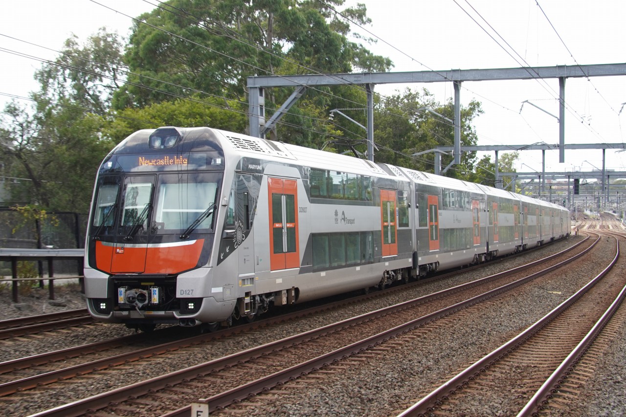 ニューカッスル・インターチェンジ行きのDsetマリユンがサマーヒル駅を通過します。Vsetはかつてニューカッスルまで運行していましたが、ブルーマウンテン線より一足早く、2025年6月をもってセントラルコースト線での運用を終了しました。