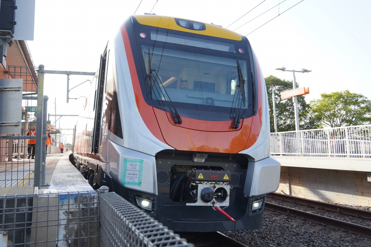 リバーストーン~スコフィールズ間を走行するR set試運転列車がやってきました!リッチモンド線は全線電化されていますが、今回の試運転ではパンタグラフを降ろし、気動車モードで走行していました。