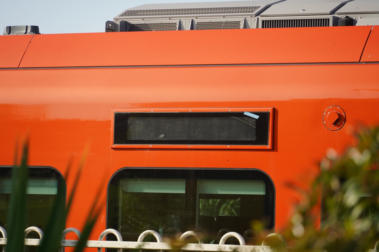通常は走ることのないリッチモンド線の単線区間を走行するR set試運転列車。R setが営業運転で使用される予定の電化区間はいずれも複線のため、単線電化区間を走る姿は試運転ならではの貴重な光景といえます。