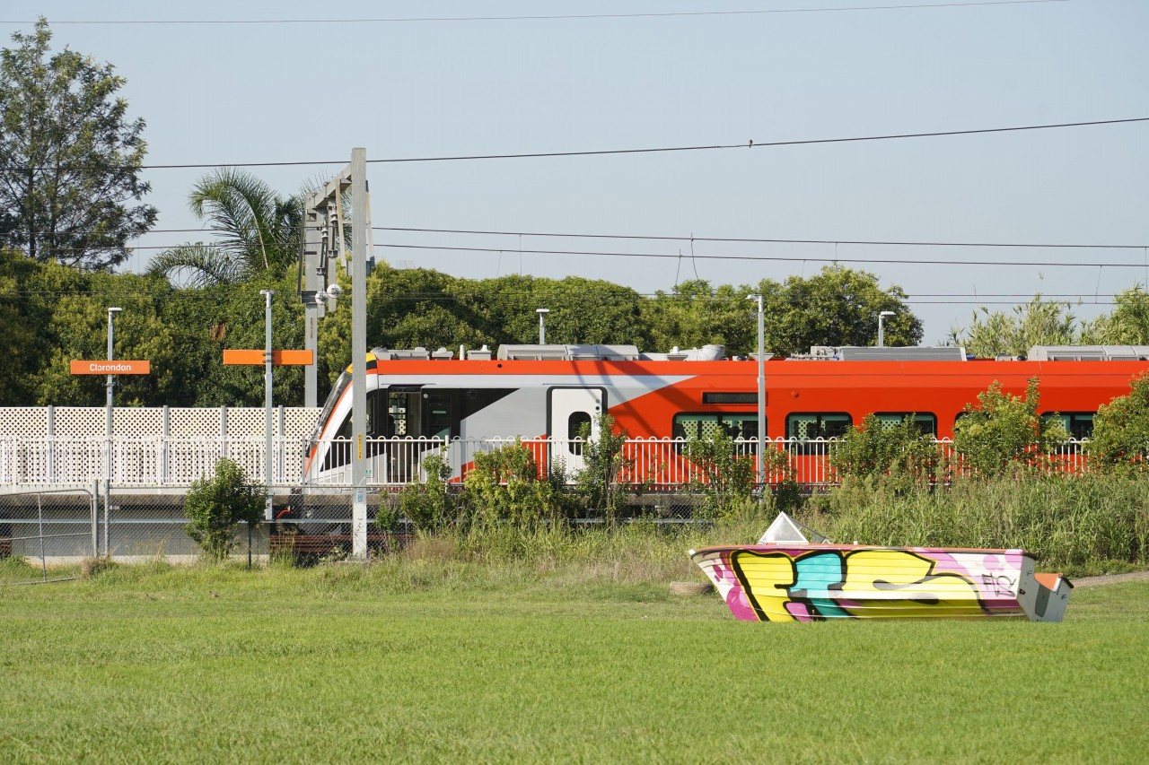 クラレンドン駅の西側には踏切があり、そこから試運転列車が停車している様子を撮影することが可能です。ただし午前中は強い逆光となりやすく、撮影条件はやや厳しめです。