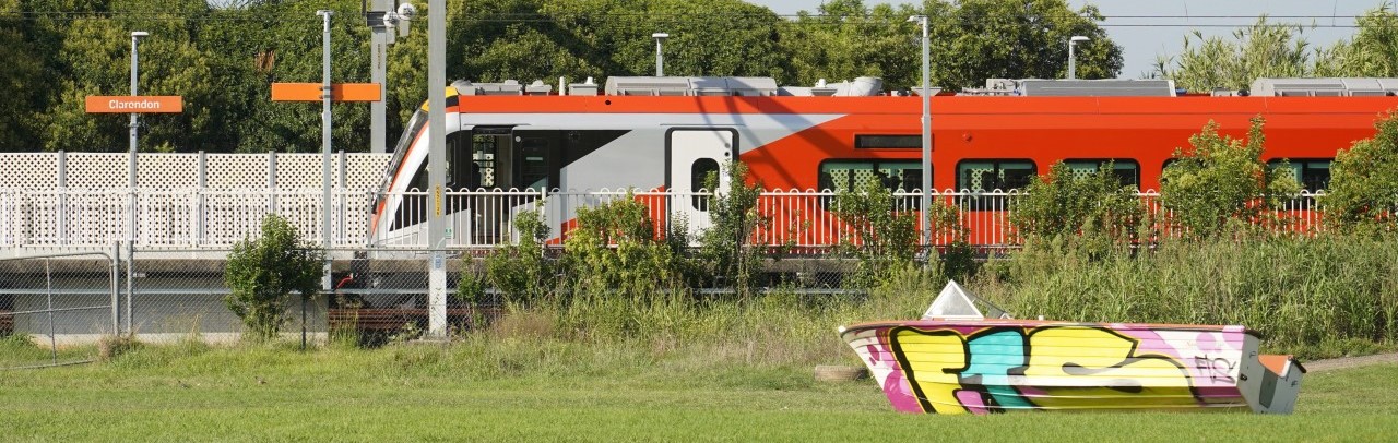 クラレンドン駅の北側より。ペイントされたボートのそばで、R setがのんびり休憩しているような光景です。このボートは隣接する洗車サービス会社の所有物で、シドニー周辺で見られるような無断の落書きではなく、意図的なアートとして施されているもののようです。