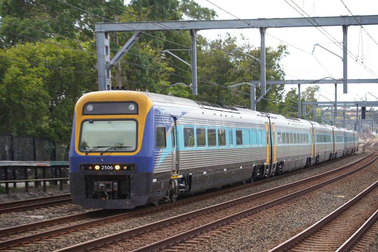 ニューカッスル・インターチェンジ行きのDsetマリユンがサマーヒル駅を通過します。Vsetはかつてニューカッスルまで運行していましたが、ブルーマウンテン線より一足早く、2025年6月をもってセントラルコースト線での運用を終了しました。